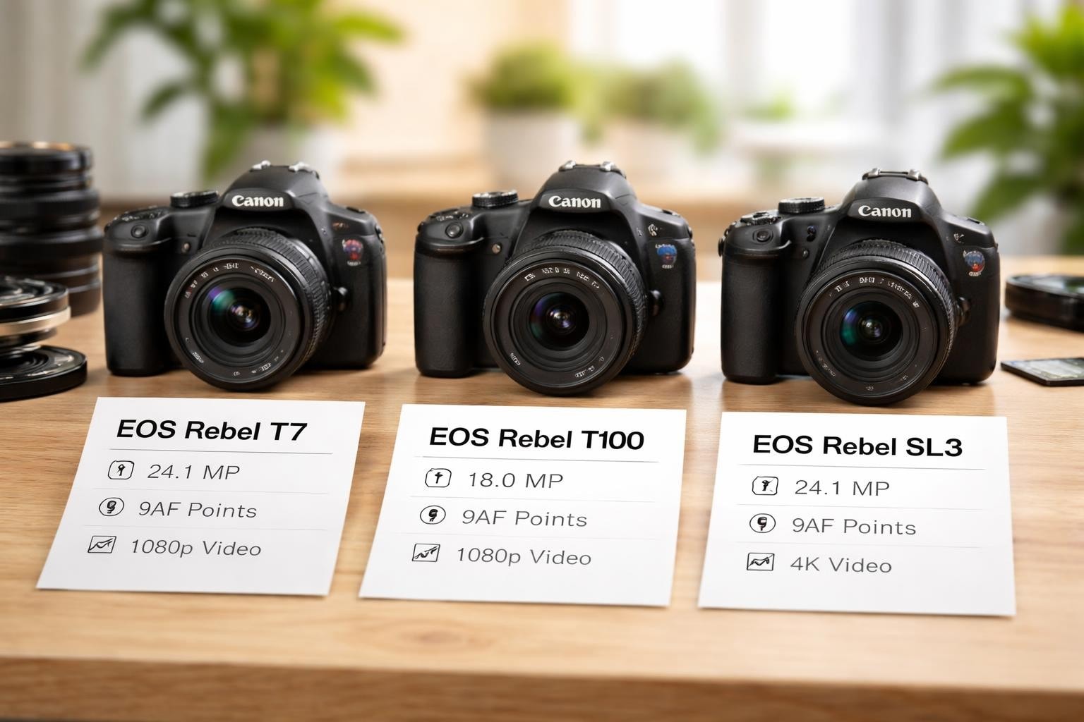 - Canon EOS Rebel T100 (EOS 4000D) as the most affordable entry point